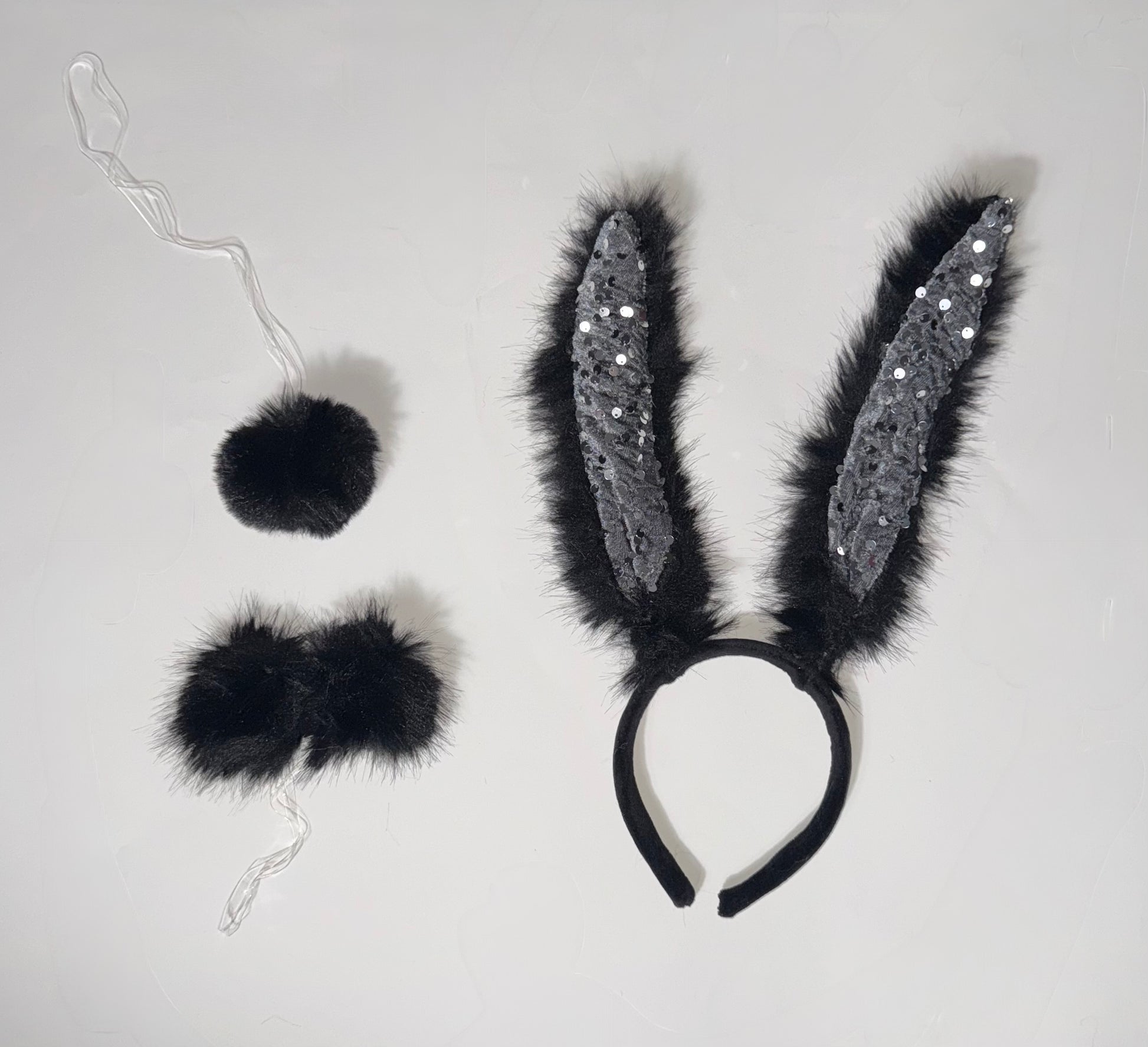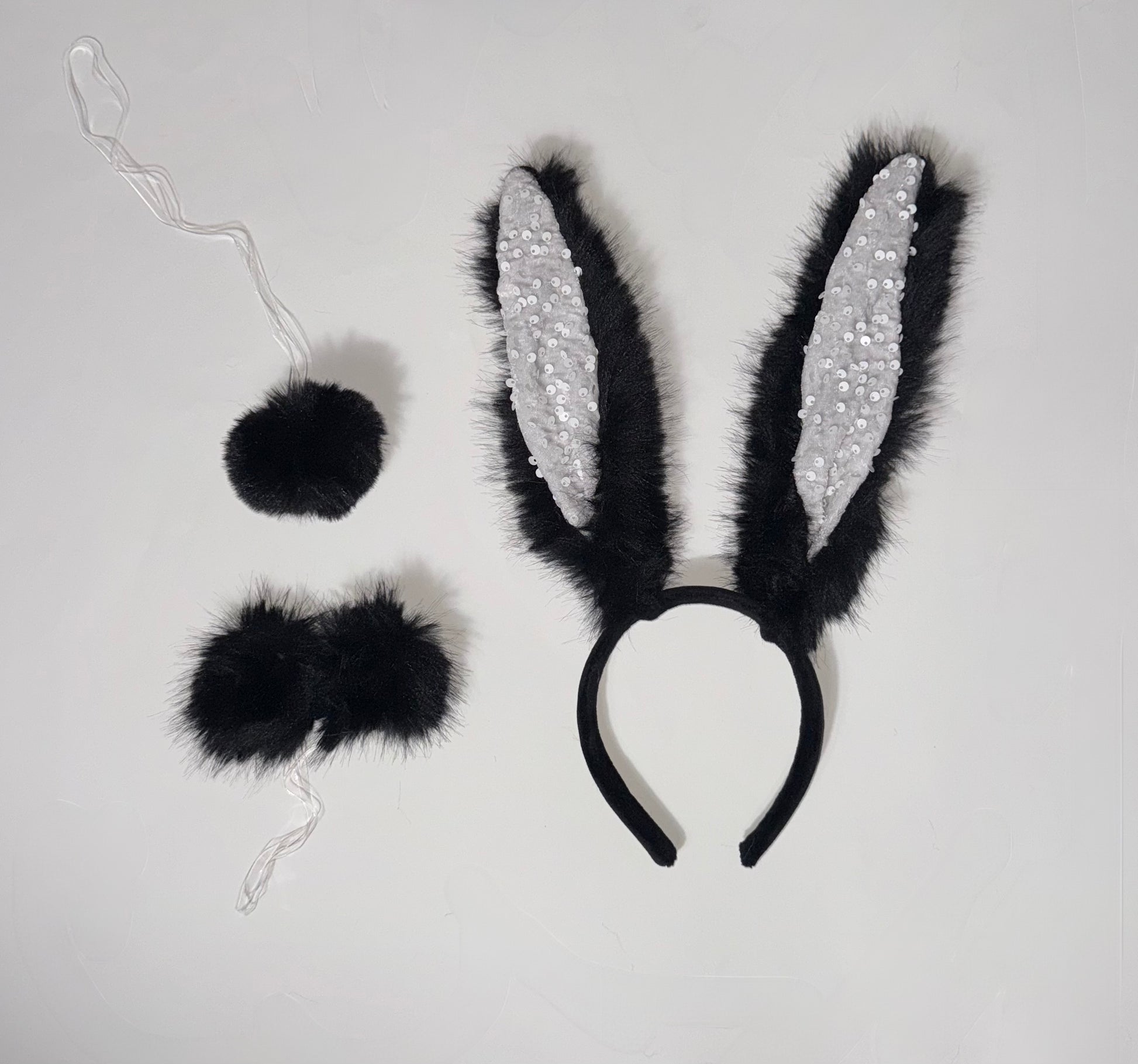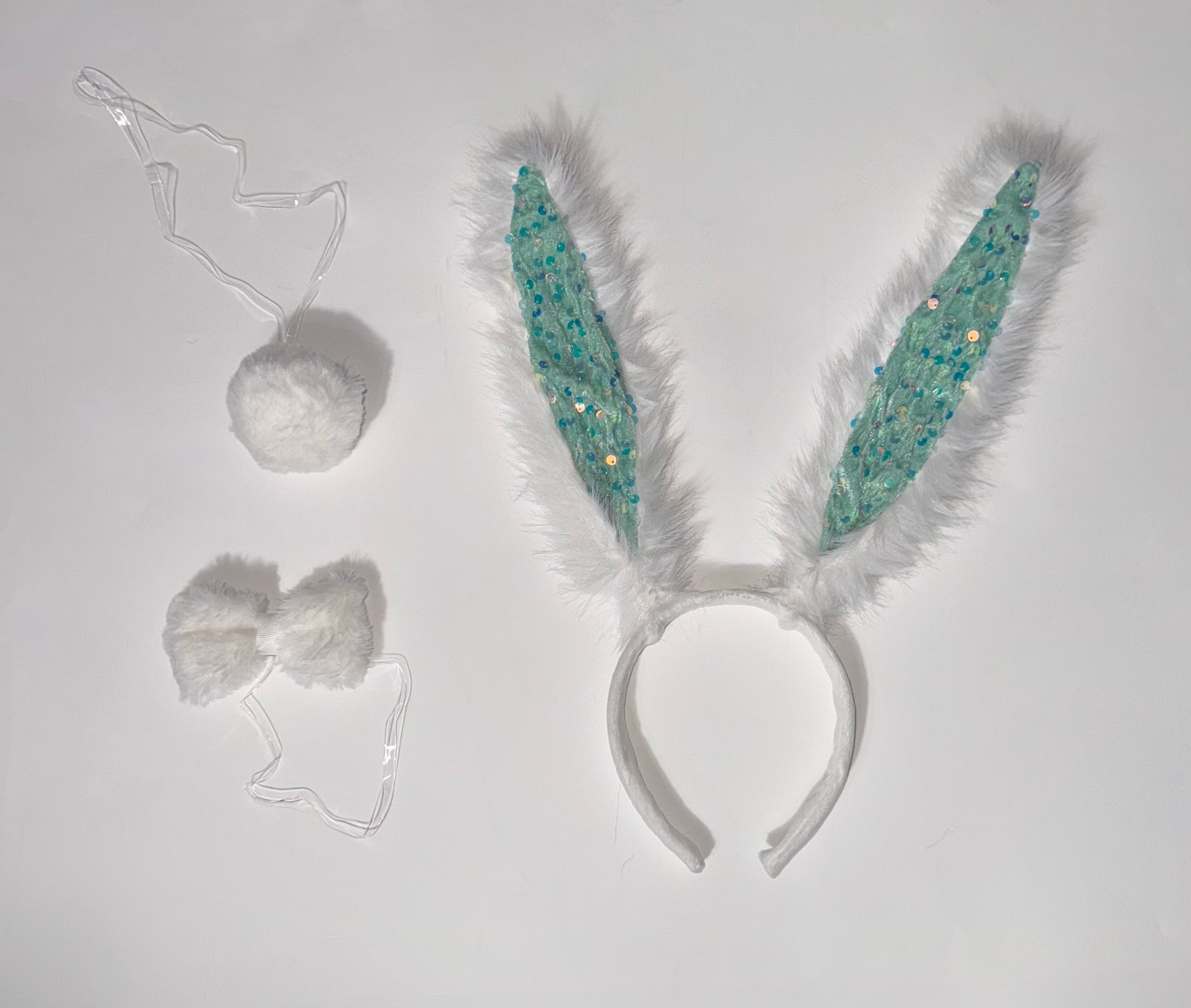 Get cute, sparkly, and ready to shine this spooky season! This 3-piece glam bunny set includes sequin bunny ears, a fluffy tail, and a matching bow tie — the perfect accessories to complete your Halloween look or add a touch of sparkle to any party outfit.